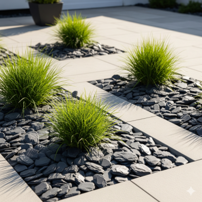 W ogrodzie sprawdza się wszędzie tam, gdzie potrzebny jest mocny, elegancki kontrast: wśród soczystej zieleni traw, na tle jasnych elewacji, w zestawieniu z białymi kamykami lub stalą corten. Kamień pochodzi z włoskich pokładów łupkowych – każdy worek to fragment unikatowej geologii.