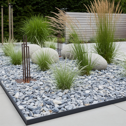 Lazur Grys idealnie nadaje się jako uzupełnienie rabatek ogrodowych. Jego chłodne barwy pięknie komponują się z naturalną roślinnością oraz ozdobami z większych kamieni. Ostre krawędzie dobrze trzymają się gleby przez co sprawi, że kompozycja nie ulegnie zniszczeniu podczas większych ulew czy pielęgnacji roślin, które są nim otoczone. Większe kamienie świetnie spisują się jako ozdobny pas wokół domu ponieważ zapewniają dużą powierzchnię do odparowania wody opadowej, co pomoże przy odprowadzaniu nadmiaru wilgoci z gleby i ułatwi pielęgnacje otaczanych roślin.